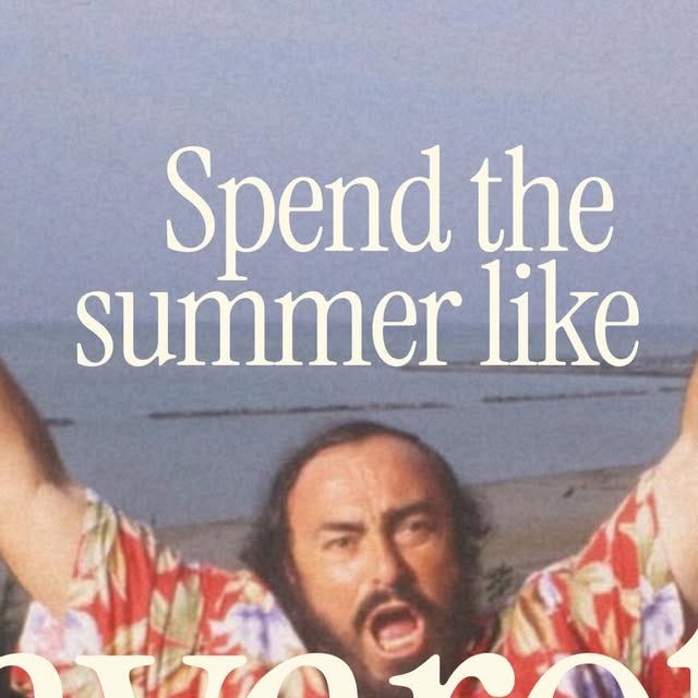 Sometimes, being chronically online can feel like the hug from a community you never knew you needed. But I don’t encourage scrolling until you find the euphoria you’re looking for. Your poor eyes and average weekly hours of screen time deserve more. That being said, I am now completely obsessed with the idea of a Pavarotti summer. Bbqs, pool parties, pasta, questionable patterned shirts and unabashed smiles. The sun sets at 7:30pm tonight and won’t set before 7pm again until the end of September. Bask in it, bitches.